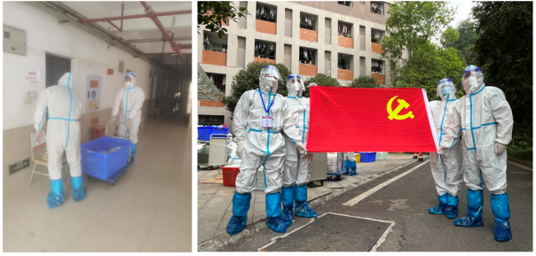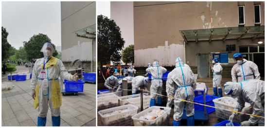 10月13日,新北区员工公寓24栋确诊员工的2名室友也相继确诊为阳性。公司党委决定成立临时党支部,组织党员志愿者团队深入疫情风险最高的24栋开展工作。原本负责核酸检录的胡磊老师听到消息后,立即积极响应,主动申请加入这个光荣的队伍。虽然那里是疫情风险最高的地方,但是他没有半刻犹豫,只想尽自己的一点微薄之力,让校园早日恢复生机。他匆忙安顿了妻子和女儿,打包上行李,义无反顾地奔赴疫情最前线——新北区公寓24栋。在后面的几天里,他和志愿者同伴们每天身着厚厚的防护服,一箱箱地搬运、一趟趟地爬楼,把物资一份份的送到员工手中,为3个楼层、100多名员工送去一日三餐、运送日用品;完成5个层楼、200余名员工的核酸检测工作。所有任务完成后,他才发现腰酸腿疼,全身早已湿透。