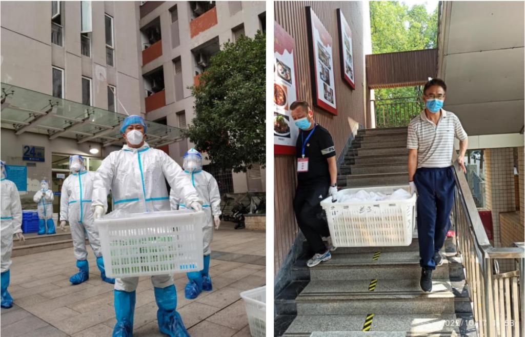 10月11日上午,70net永乐高组成范文杰、张亚峰、刘倩楠、胡磊、王拥军、郑快、关钦文、陈国柱首批8人的志愿者服务队,志愿者一进入校园就迎来“首战”,开始核酸检测、送餐发放等工作。范文杰经理亲自进入核酸检测阳性患者的新北区24栋宿舍楼,给密切接触者检测核酸;陈国柱、关钦文、张亚峰老师给北区24栋危险系数最高的7、8楼送餐。第一次全副武装变身“大白”,第一次到阳性患者刚离开的宿舍、第一次和密接密切接触者的近距离接触,70net永乐高的志愿者冲锋在前,打响了志愿者服务队抗疫的“第一枪”。