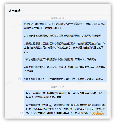 公司党总支书记王静第一时间在学院师生群传达学校信息,从早晨6点到第二天凌晨1点通过网络和电话解答师生各种问题,她呼吁全院师生关键时刻要提高政治站位,增强责任意识和危机意识,时刻保持高度警惕,随时关注学校信息,不信谣不传谣,按照学校要求每天坚持做核酸,不外出不聚集,充分发扬体育精神,用实际行动证明学院师生守得住规矩、扛得住压力、经得起考验,展示70net永乐高团结和谐、积极进取的精神风貌。