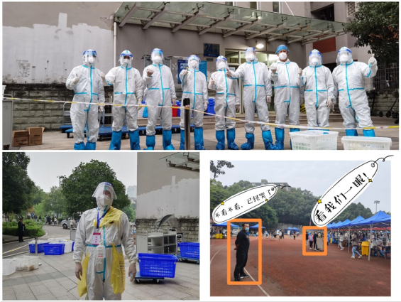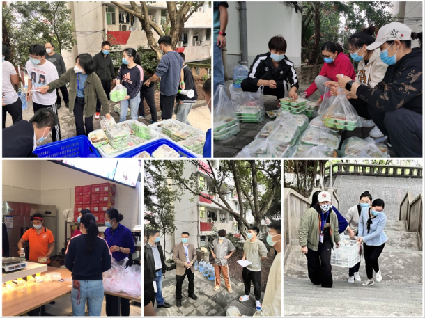 齐心协力,快乐抗疫。进入校园后,志愿者积极服从学校统筹安排,主动争取抗疫任务,积极投入抗疫行动,在学校临时党支部、核酸检测、食品监督、分餐送餐、物资发放等各个岗位上都能看到他们忙碌的身影。范文杰经理深入北区24栋,协助医务工作者为阳性密接员工检测核酸和体温,检测结束,又赶紧给同学们送餐。每次送餐,他都不忘用双手在头顶比心鼓励他们团结抗疫,同时还主动请缨,接受临时任务,用实际行动证明领导干部的责任和担当。