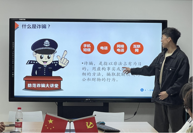 随后,志愿服务队的许吉文同学宣讲反诈骗相关知识,并结合近期南岸片区及公司员工被诈骗相关案例,向同学们分享一些防诈骗方法,如注册使用“金钟罩”反诈防骗小程序、下载国家反诈APP。